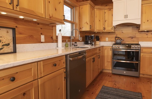 as you enter the home, you are greeted by a large lower level mud room with plenty of “out-of-the-way” storage for your belongings, and a half bath Head up the stairway to the large open main level living and your breath is likely to be taken away by the views over Glen Lake, Sleeping Bear Point and Lake Michigan. The cabin boasts a traditional A-frame style, with a comfortable modern lodge feel. The open living area features a large vaulted ceiling with floor to ceiling windows and a natural stone fireplace, open concept kitchen, and dining area. The kitchen is updated (2019) with new appliances and a large kitchen island for gathering around.