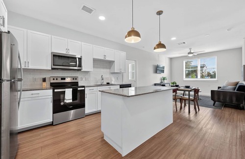 unleash your inner chef in the well-equipped kitchen Stainless steel appliances gleam under modern lighting, while ample counter space provides plenty of room for meal prep or whipping up a culinary masterpiece.