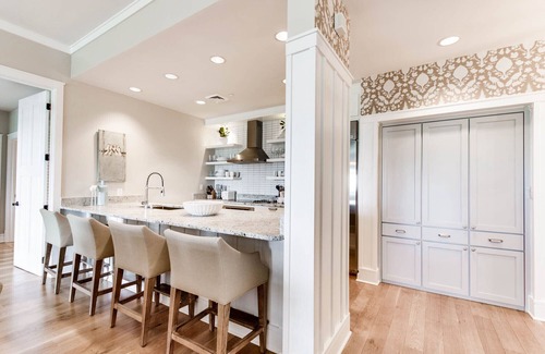 a warm welcome awaits just inside, where guests will enter into the home's inviting main living area This space features an immaculate gourmet kitchen with stainless steel appliances, granite countertops, and lovely custom cabinetry. The breakfast bar boasts 4 dining seats, and an additional 6 seats are available the adjacent dining table. The living room offers a wonderful place to relax and unwind, with plush and comfortable seating, a flat-screen television, wonderful natural light from the large windows, and breathtaking coastal views. French doors lead out to the home's balcony, where guests can enjoy an invigorating sunrise with their morning cup of coffee or a peaceful sunset with a refreshing evening cocktail.