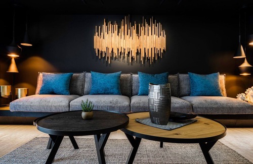 immerse yourself in this bold and stylish apartment, centrally situated in athens The impressive color scheme of black and grey, accented with bright blue and wooden nuances, imparts a modern feel. Impeccable design details add a touch of class throughout the spacious living and dining area, which features a sumptuous elongated sofa, four extra-comfy bedrooms, four bathrooms, and an intimate, sleek kitchen. This freshly renovated 5th-floor luxury apartment spans 160 square meters and embodies the best of modern Greek design. The open-concept living and dining area showcases a large grey sofa with a unique wooden sculpture above it, serving as an interesting focal point. Natural light floods the main living space through glass doors leading to the balcony, where you can catch a glimpse of the Temple of Olympian Zeus.
