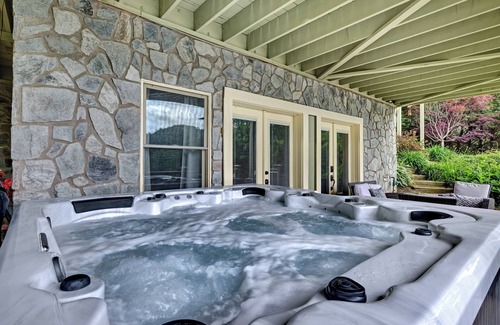 Picture yourself sitting on a spacious porch, looking down on the glistening sun-lit water of one of the most beautiful lakes in the mountains. Split Rail sits on a hill overlooking Lake Glenville, a pristine lake with 26 miles of shoreline, located just 8 miles from Cashiers. This is the highest lake in elevation east of the Mississippi River. An open floor plan with many windows allows for a ton of natural light. The kitchen has stainless steel appliances, granite countertops, and an island with seating; there is a grill on the main floor deck. In the living room, under the soaring tongue and groove ceiling, enjoy a stunning view of the lake, a fire in the large stone fireplace, while relaxing on the over-stuffed sofa. There is a large Smart TV in this room, with access to YouTube TV and other apps. The entry level guest room features a king bed and sliding glass doors to the deck overlooking the lake. An adjacent full bathroom also serves as a powder room for this floor. Upstairs offers a master bedroom with a king bed, a large Smart TV, a private bathroom with shower and jacuzzi tub, and access to a private balcony overlooking the lake. There is a large second guest room on this floor, with a king bed, a large Smart TV, and a full bath. The lower level renders another living area with a large couch that seats at least 6, a 65" Smart TV, a gas fireplace, and pool table. The lower-level bedroom has a queen bed and twin bunk beds, a TV, and uses a bathroom with a double shower. From the lower level living area, there are double French doors leading to an outside infinity deck overlooking the lake, seating area, and a hot tub. There is separate entrance to the very spacious garage apartment which has two queen sized beds, ceiling fans, a flat screen TV, and a private bath with shower/tub combination. The apartment offers sliding glass doors to the private balcony, providing natural light and a view of the lake, as well as a kitchenette with a mini fridge, sink, coffee maker, and microwave. This home also has a private dock located just a short walk down the driveway. There are 2 kayaks available. You also have use of the garage.