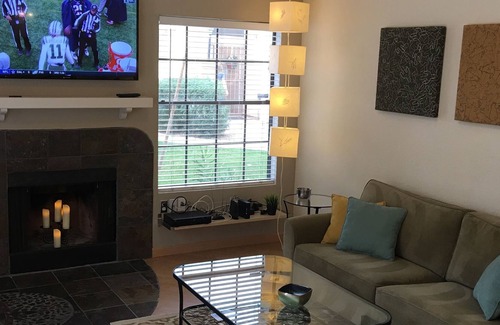 50” flat screen tv above fireplace, queen bedroom set with linens, towels, pool towels, desk with office supplies and charger for laptop and mobile devices, full kitchen appliances, dishes, pans, keurig and drip coffee machines, crockpot, blender, mini chopper Washer/dryer inside the unit, iron & board, hair dryer and most home conveniences supplied.