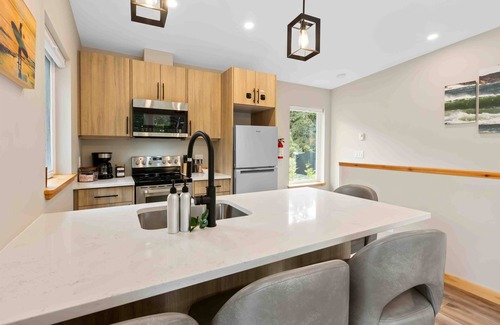 with two cozy bedrooms featuring queen beds on the main level and a double pull-out couch upstairs (sleeps one guest), this cabin is ideal for small groups or families Upstairs, you'll find a fully equipped kitchen, complete with a dishwasher and a kitchen island that seats four—perfect for fueling up before your adventurous day. The cozy living room provides an ideal space to relax with a good book or enjoy a few board games. Step outside onto the upper deck to take in the natural forest surroundings. The cabin also features a washer and dryer, making it an excellent choice for longer stays.