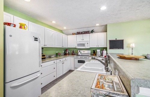 the kitchen is fully stocked for everyday meal prep Dishes, pots and pans, silverware, glass, etc. and a drip coffee maker is available for guest use. Additional kitchen items include dishwasher and toaster. Also included: bed linens, bath towels, basic cleaning supplies, and household soaps (not personal soaps), and a starter set of paper products.