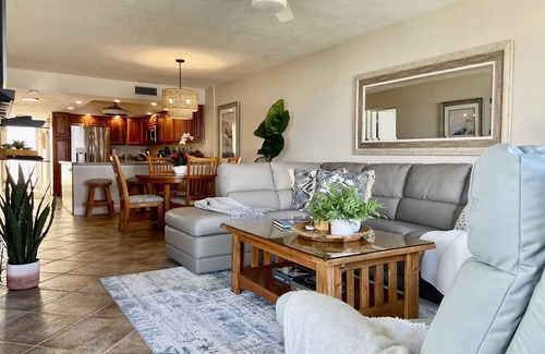 the living area looks directly out at the ocean There are 55" and 43" flat screen Samsung televisions for your enjoyment with numerous cable channels and internet ready.