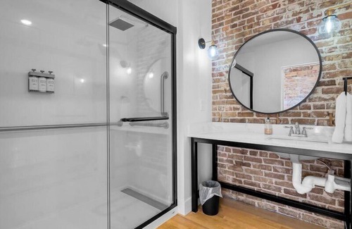 enjoy west and south views in this bright 316-square-foot corner room, 3 walls of exposed brick featuring one king westin heavenly mattress on a black metal frame along with a baltic birch top desk and leather office chair Enjoy the brick exposed wall and the original 1915 maple flooring. Brick walled vanity with a step in 5' shower and rainfall shower head.