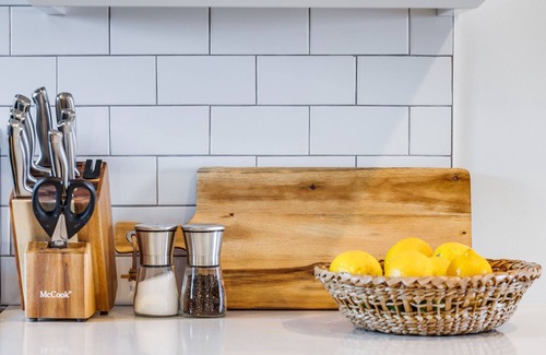 the fully equipped kitchen offers modern appliances, ample counter space, and a layout that flows into the dining and living areas, making meal prep a breeze