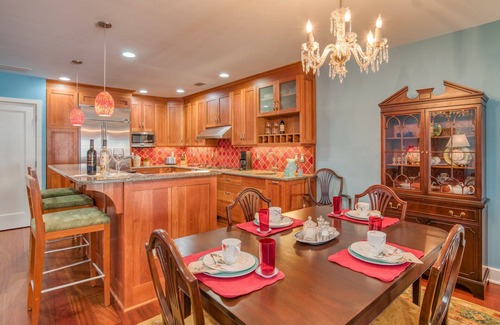 luxe furnishings surround you inside this spacious 1600 sf apartment which features a large gourmet chef's kitchen The fully-stocked kitchen has an oversized bar and is open to the dining and living areas. These areas together serve as a great gathering space and also open up to the balcony over St. George Street which extends the width of the apartment and is a great place to enjoy a glass of wine and watch the passers-by. Experience hardwood floors, high-end European style furniture with modern touches and lush color palette throughout the apartment, and fully involved cable TV in the spacious living area. The Master bedroom, with adjoining Master bath, is at the opposite, quieter end of the apartment facing Spanish Street. Between the Master and the living areas is a second bedroom with two twin beds, and a hall bath. Both bathrooms are outfitted with modern finishing, plush linens and sauna showers, and the Master bath also has a luxury 6 foot whirlpool bathtub with champagne bubbles. Rest well after a day of exploring in beds that are dressed with sumptuous all-cotton linens.