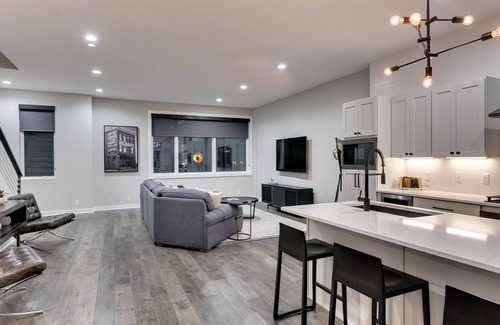 Market's Edge is a 4-level urban, townhouse with a beautiful open-concept kitchen & living space opening up to a quiet and cozy backyard. Enjoy two bedrooms appointed with high-end furnishings and linens as well as en suite bathrooms with bidet toilets. The primary bedroom has an inviting king bed and a walk-in closet. The second bedroom has a sturdy, Restoration Hardware "Full over Queen" bunk bed to help accommodate extra guests. Our favorite space is the rooftop terrace with an outdoor sectional couch and firepit overlooking beautiful views of downtown Omaha.