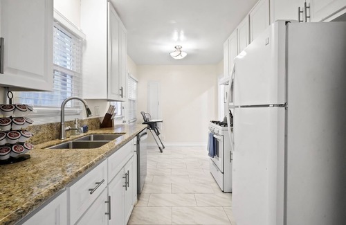 the kitchen is equipped with pots, pans, bakeware, appliances, utensils, spices, and cooking oil Enjoy a Keurig coffee machine with a starter pack of pods for your convenience, ensuring a comfortable and delightful stay.