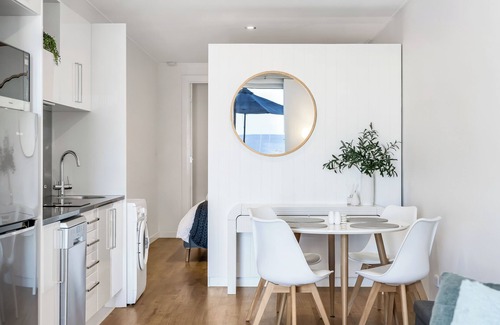 a modern beachfront studio apartment, with all the makings for a perfect seaside getaway
