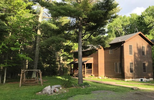 we offer all of the conveniences of modern living including a fully equipped kitchen, laundry and for those who need to stay in touch; wireless internet and direct tv This is a gorgeous 4 bedroom redwood sided home, (2650 square feet), with rustic log accents throughout. New birch kitchen cabinets, with stainless appliances and vaulted ceilings.