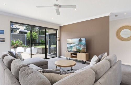 the property comfortably accommodates up to 10 guests across four generous bedrooms: two with queen beds, one with two bunk beds (four singles), and one with two single beds It features two bathrooms, including a main bathroom with a deep bath and a separate toilet, and an ensuite with a twin shower rose. The fully equipped modern kitchen includes a full-size fridge, dishwasher, microwave, and a 4-burner cooker. The open living and entertaining space extends to a substantial courtyard equipped with a gas BBQ for outdoor dining.