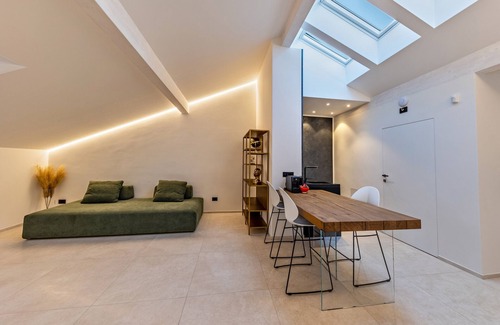 the outstanding features of this apartment are the open spaces, an elegant design in the colors white, gold and wood, and the integrated, dimmable led system, which ensures cozy hours and the perfect atmosphere
