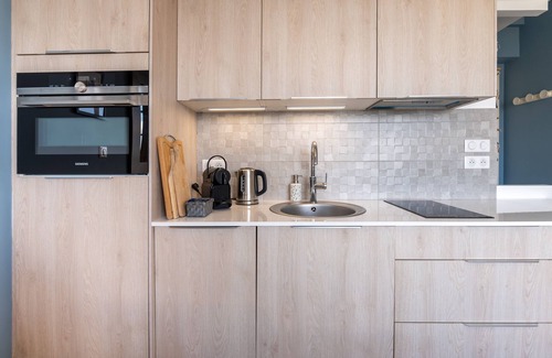 facing the sea, this studio was refurbished in 2017 Its contemporary decor in seaside colors is the key to its charm. A practical, fully-equipped kitchen is the perfect place to enjoy your meals. The sofa bed has been carefully chosen for its comfort and ease of opening.