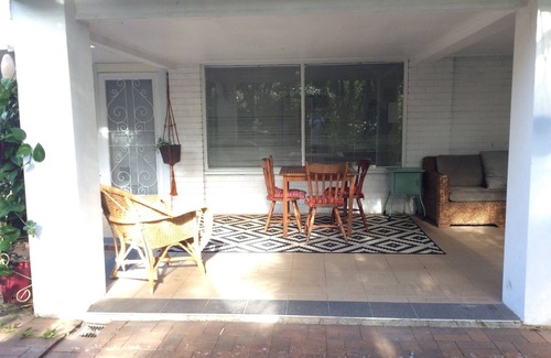 Unit is located in a very quiet suburb close to the city by bus or car. The unit has a large covered patio area edging on an enclosed garden area. The kitchen has fridge, induction stove with oven and microwave and adequate bench space adjacent to a dining area. The bathroom has a shower, toilet, vanity and washing machine. A free standing clothes rack is available.