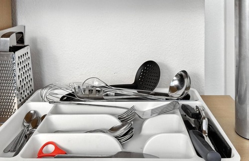 prepare a home-cooked meal in the kitchen, complete with a stovetop and a refrigerator, as well as a coffee maker, a microwave, and cookware Enjoy the WiFi and TV. Bathroom amenities include a hair dryer and towels. And because there's a washer and dryer, you can go a bit lighter on your packing. Other amenities at this 1-bedroom, 1-bathroom rental include bed sheets, a desk, an ironing board, and heating.