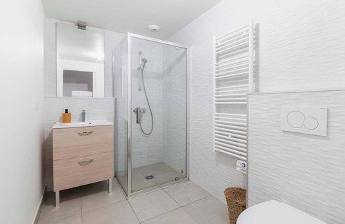la salle de bains est moderne et équipée d'une douche spacieuse, de toilettes et de tous les éléments essentiels pour un séjour confortable Des serviettes de bain sont également fournies.
