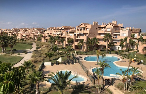 in addition to the 18-hole golf course, the resort has a 5-star hotel, gym, a world class spa, numerous communal swimming pools, tennis courts, mini golf, table tennis, bike hire, a supermarket and several restaurants and bars It is located just a 10 minute drive from the beautiful Los Alcázares beach and the Mar Menor lagoon which has fantastic water sports facilities. The resort is just 25 minutes from Murcia International Airport and 55 minutes from Alicante Airport.