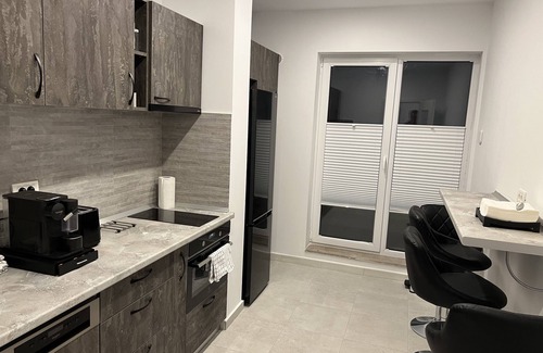 The3-Room penthouse is located in the Militari district, not far from the Plaza Shopping Mall, the AFI Shopping Mall and in a quiet location on Lake Morii. The center (Old Town) is not far from the apartment. The apartment has a view over Bucharest. At night, the lights of the illuminated city can be seen from the living room and bedroom, as well as Lake Morii. The penthouse is luxuriously furnished. High-quality German parquet, a modern built-in kitchen with BOSCH Home Connect devices such as a refrigerator, dishwasher, oven with microwave and steam function, ceramic hob and Nespresso coffee machine round off a black kitchen. The penthouse has a roof terrace to the east (20 sqm). The apartment is fully equipped with E-Home, all functions can be controlled via Apple Homepods, such as heating, air conditioning, Apple's sound system brings music to every room with Apple music. The bathroom is equipped with a modern shower and a modern look. The electronic door lock from Nuki facilitates access via keypad and the elevator gives you direct access to the underground car park. A parking space in the underground car park is available. The apartment is equipped with a single room air conditioner. (in every room). There are 2 Sleeping-Rooms and one Living Room..