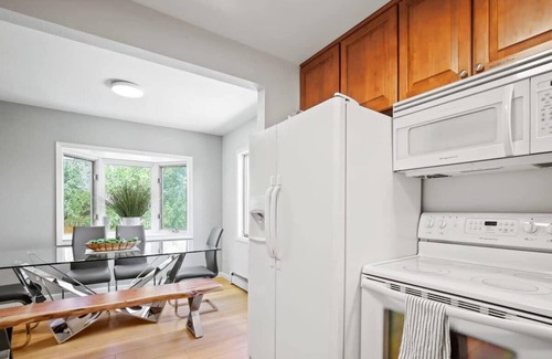 the charming kitchen area boasts abundant cabinets, modern black countertops, bright, white appliances, and everything you need to whip up a meal from a toaster to a coffee maker Enjoy lovely views from the window above the double-basin sink and, if any laundry is needed, this space also includes a stacked washer and dryer.