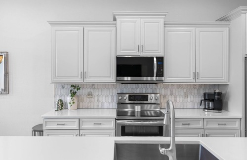 in addition to its prime location, our beautifully decorated villa offers an open-concept floorplan and a fully equipped kitchen with stainless steel appliances, an oversized island, and all the cookware and dinnerware needed to prepare your favorite meal The spacious dining area offers seating for six, with additional bar seating for four. The carefully curated living area is designed with relaxation in mind, offering plush seating, a brand new 85-inch television, and access to the screened-in patio—the perfect spot to enjoy your morning coffee while admiring the stunning golf course views. Just outside the patio you’ll find a propane grill, making it easy to take mealtime outdoors and enjoy a laid-back cookout with family and friends.