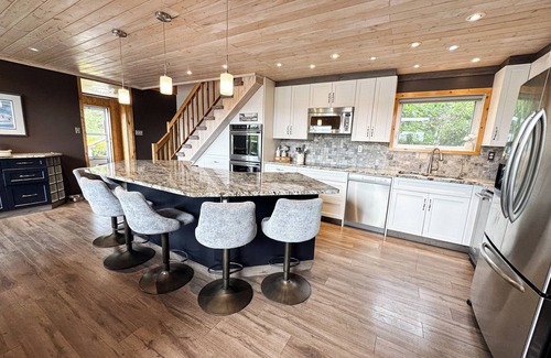 this three bedroom two bath home on the water is stunning The primary bedroom comes with ensuite and sliding glass door to the deck. The fourth bed is on the loft with the best view in the cabin. The views from the high profile setting are out of this world. With three kings and a queen bed there's room for everyone. Bring the whole family and enjoy the spacious living room and dining room. Sit down to a delicious meal after cooking in the gourmet kitchen. If your looking for a beautiful home on the water to relax in you've found it..