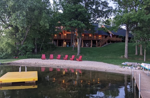 Stunning private peninsula cabin on Little Jay Gould Lake (part of the Pokegema Chain of Lakes.) 5000 square feet of incredible Montana pine logs with beautiful views of the lake. Private sandy beach with adirondack chairs for relaxing, fire pit and a dock for boats. Amenities include a large deck with lake views, paddle boat and a separate lake access on the property where you can put your own boat in. The log cabin has a pool table, chef's kitchen and fireplaces. We have security cameras in the front driveway and back deck of the house for your protection and ours..