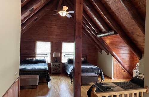 the loft, which features incredible vaulted log ceilings, unique log cubbies and windows, has three queen beds