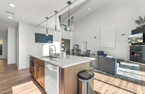 inside, you’ll find a spacious living area with large windows, high ceilings, and a cozy fireplace The fully equipped kitchen is perfect for preparing meals, which you can enjoy at the dining table while taking in the stunning vistas.