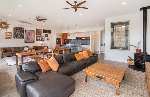 there is a comfortable lounge and with a smart tv, as well as a festive dining table with seating for 12 Kanangkal House boasts a passive solar design, however the lounge area has a large reverse cycle air conditioner, and there are ceiling fans throughout the house to keep you cool during those really hot days. and let's not forget the pot belly fireplace to crank up in wintertime!