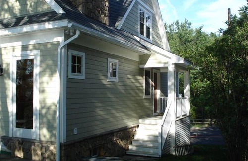the original cottage named 'the doll house' was razed in 2007 and a new craftsman type bungalow was constructed in 2009 The new home consists of 2200 square feet containing a gourmet kitchen, and ample closet space on all floors.The views from almost everywhere in this home, designed by a popular local architect, are spectacular and the room planning was well is even a nice, bright laundry room in the basement with stereo speakers . .... And a spot to place the ironing board upright and leave it that way if you care to! There is an extra 'bonus' area in the basement available for an additional rental charge. Sofa bed, loveseat, plus a lovely 3/4 bathroom, 4 large windows and separate entrance define this lower level.