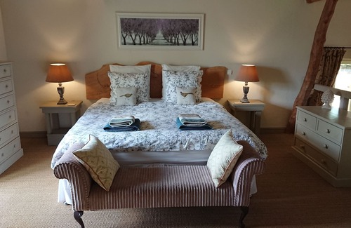 there is a double bedroom on the ground floor and a separate cloakroom with toilet Up the original staircase you arrive on a large landing area leading to two spacious bedrooms. One is a double and the larger one sleeps three. A large family bathroom is in the middle and includes a bath and a walk in shower.