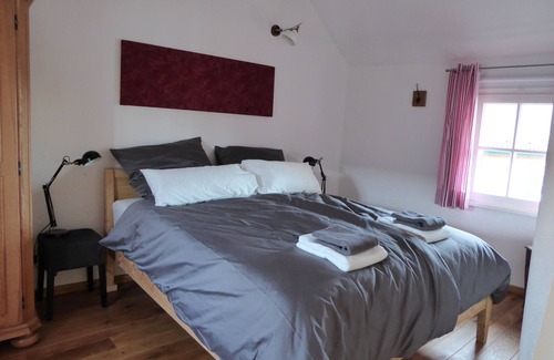 open, well-equipped kitchen with fireplace, guest toilet and washing machine Open bedroom with high quality beds and living room with oak floors are located under the open gable. TV, modern tiled bathroom with shower. Infrared heating, clay plaster inside, thoroughly insulated. Open truss, nice view of the Fountain Square with historical Ziehbrunnen.