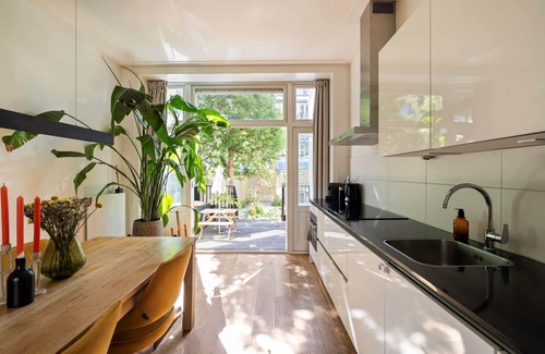 this bright and stylish apartment in the heart of amsterdam offers a comfortable stay with natural light, tasteful furnishings and a nicel landscaped garden