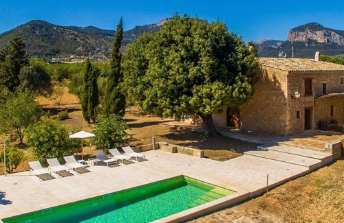 you enter the house through the wrap-around terrace, from where your first "stop-over" is a small entrance porch, the character of which is determined by a lot of natural stone on the walls as well as river pebbles on the ground The stairs to the upper floor are decorated with typical Mallorcan flower tiles - a magical contrast to the ancient stone walls! From here, you can directly enter the large living room with fireplace, TV and its own access to the terrace. You can also move freely between outdoor and indoor and always choose the best lounger or seating area. Right next door, you will find the generously-sized, modern and fully equipped kitchen with a dining table - perhaps on cool days you'll want to light the fireplace and conjure up comfort and cosiness. A real eye-catcher here is the high china cabinet, in which colourful, decorative wall plates glitter prettily. Practical tip: there is access to the terrace from this point as well. Two bedrooms that share a bathroom with shower are also located on this floor. On the upper floor, there are two additional bedrooms, which share a bath with tub. The interior of the villa impresses as a whole especially by its excellent combination of old, restored furniture and modern elements and surfaces, such as those found in the kitchen and the bathrooms. The thick walls of the building create a balancing climate, especially during the summer, so that it stays pleasantly cool even on hot days.