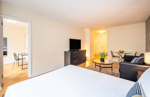 this beautiful studio apartment located in a classic 1950s high-rise in murray hill features an open layout, hardwood floors, large closets and a newly renovated white marble bathroom The apartment also offers a stainless steel full-sized kitchen with granite countertops and large windows. Building amenities include a state-of-the-art fitness facility, doorman coverage, attached garage and on-site laundry room. All beds provided are fitted with plush linen sheets and pillows. All Furnished Quarters apartments include 24/7 guest service.