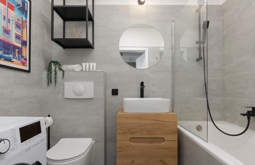 stylish warsaw studio in ochota district offers accommodation for 3 people It is an excellent option for a couple or a group of friends. The 36 m² apartment includes a living room with a designated sleeping area, a kitchenette and a bathroom with a bathtub. The apartment is decorated in a modern style, using vivid colors and fashionable accessories - making it not only functional, but also an extremely stylish place to stay in the capital. From the living area you can access the balcony, from which you can enjoy a magnificent view of the city. The apartment is supplied with all the necessary basics. Excellent equipment of the apartment with necessary kitchen appliances (dishwasher, kettle, microwave), as well as bathroom appliances (dryer, washing machine) guarantee guests the highest comfort of rest. Multimedia facilities include a TV with SmartTV technology and access to high-speed, free WiFi connection. A complimentary set of toiletries (soap, shampoo and shower gel), towels and linens are provided to facilitate the start of each stay.