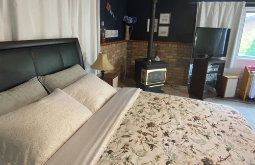 Suite (1 room 576 sq ft): Queen bed plus sleep sofa, full bathroom, kitchenette w/bar fridge, coffee maker, kettle, conv. oven, dish wears, table & 4 chairs. Private entry & deck w/grill. Gas fireplace, tv, wifi 250/250. Shared service entry/hallway..