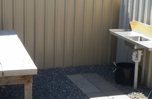 outdoors include a bbq area, rainwater tank, clothes line, large grass area and a shaded spacious decking with table and chairs Outdoor Fish cleaning facilities.