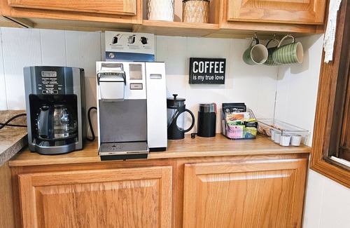 additional pull-out couches in the living room A fully stocked kitchen for easy meal preparation, a coffee bar, and a sandwich station.