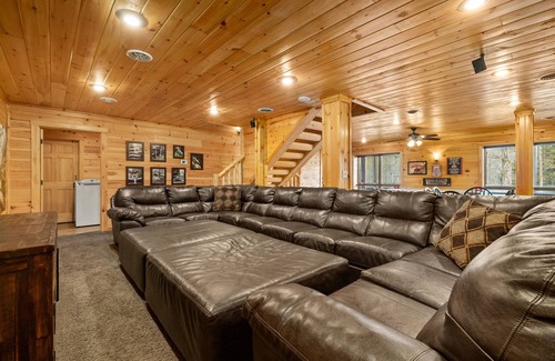 - great room has a vaulted ceiling with impressive log gables above, a gas fireplace with a stone chimney, massive leather sectional that seats 10+, and a flat-panel tv with hd satellite and blu-ray The windows provide a stunning view of the woods in front of the lodge. You won't want to leave this room - Unless it is to go to the indoor pool house and enjoy 2 pools! 14' X 30' heated pool is wonderful for the entire family. The turbo water slide will keep your kids, little and big (!) busy for hours. The second pool is made for mom's who need some help with little ones. it is 11' x 13' and shallow so that you can relax on a chair and read a book without the constant attention you would have to give them in the main pool!