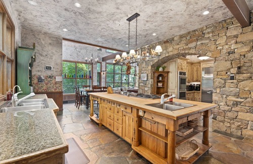 if you’ve finally worn yourself out, it’s time to settle down for the evening Take your choice from one of the 12 bedrooms set throughout every level of the home. Spend an evening in luxury as you soak in your private tub and warm up by your bedroom’s fireplace, before turning out the lights. After waking to the sound of the nearby stream, you’ll have another day of adventure and leisure ahead. Enjoy breakfast in the sun-soaked kitchen or lounging on the outdoor deck of your choice. The dining and kitchen tables will comfortably sit up to 21. Spend your morning exploring the elaborate train system, which is suspended overhead and travels through the walls of the main floor. Become lost exploring the endless delights of the home, which include a spiral staircase leading to two hidden rooms, a shaded sandbox and outdoor swing for kids, spacious lawns for outdoor dining and meetings, two bunk rooms, bluetooth music, Alexa, 3 flat screen TVs, radiant heat throughout the home, exquisite landscaping, a generator (which will power on automatically in case the home loses power), and endless outdoor adventures. If you’re traveling on business or hosting a company retreat, a mini business center is situated conveniently on the main floor and is equipped with a printer, whiteboard, and a selection of basic office supplies in case of a pinch.