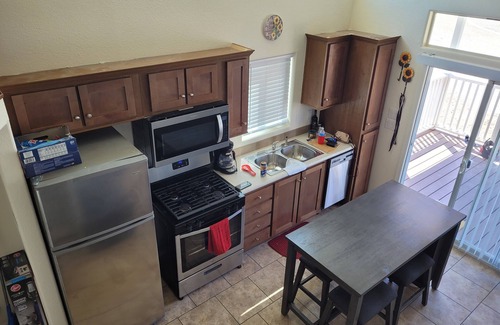 Discover the unique charm of Tiny Home @ AZO – a personal retreat, distinct from typical resorts. Unwind in the master bedroom with a queen-size bed and smart TV, complete with included WiFi. The loft boasts a Queen and Cal King bed, but beware of the low ceiling. The fully equipped kitchen, smart TV in the living room, and convertible couch offer comfort and convenience. Enjoy natural light on the porch with picturesque views. The clubhouse, showers, and laundry room are conveniently opposite the cottage, while the pool and dock are within walking distance. Embrace summer days on the river slide or explore nearby trails with your Razors or toys. Accommodating up to 6 people, the home is steps away from the Colorado River and a short drive to Quartzsite. For larger groups, AZO's website features additional homes and cabins. Note: Beds have sheets in the summer; blankets and sheets are provided in other seasons. Rest assured, the exterior is monitored with video cameras for security..