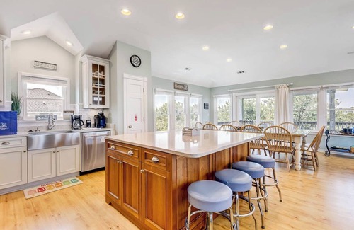 inside, you'll find a thoughtful floor plan and bright, beachy décor that makes it easy to settle in The wide dining table and large kitchen island with bar seating provide plenty of room for meals at home, or step out to the deck and watch the sun glint across the lake—cast a line if you've got your fishing license handy! A lofted reading nook, four master bedrooms, multi-level decks, and a ground-level rec room ensures space for everyone to spread out, or gather outside around the private pool and hot tub. Whether you're enjoying a fresh catch dinner, playing a board game, or lounging after a beach day, this property is built for family fun.