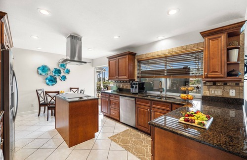 our large granite and stainless kitchen is fully stocked for cooking at home, including not just plenty of cookware and dishware, but also a keurig coffee maker, vitamix, and breville tea maker The kitchen opens onto the huge living room with high ceilings and sliding doors out to the pool area! High quality leather furniture and comfortable upscale decor make any time you spend inside a pleasure. The dining room and den are at the front of the house, making it easy to enjoy different activities even with a larger group.