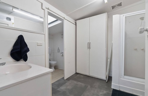 the master bedroom has a queen bed, while the larger second bedroom sleeps 4 guests in 2 x single beds, and single bunks The integrated bathroom and laundry include a shower, vanity, toilet, washing machine and dryer.