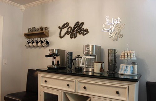 *coffee bar: equipped with breville espresso/cappuccino machine, french press, and cuisinart 14 cup coffee maker Assorted espresso and flavored coffees, regular and decaf. Hot chocolate, assorted flavors of coffee mate, assorted flavors of tea.