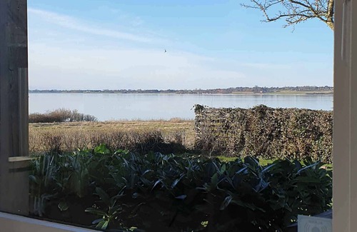 life is best when you enjoy the sun from the 78 m2 partly covered wooden terrace where you can always find shelter, privacy - and of course, sea view Or enjoy a meal indoors at the large dining table and relax in one of the house's cozy nooks whilst you always having an eye on the lovely view over the water to Bogø and Møn.