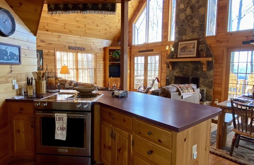 inside, you'll find a warm and inviting space with a bedroom and bath on the main level, plus an upstairs bedroom, bath, and single sleeper sofa—comfortably sleeping up to five The open loft provides a peaceful reading nook with scenic views, while the spacious living and dining areas center around a stunning Tennessee mountain rock fireplace.